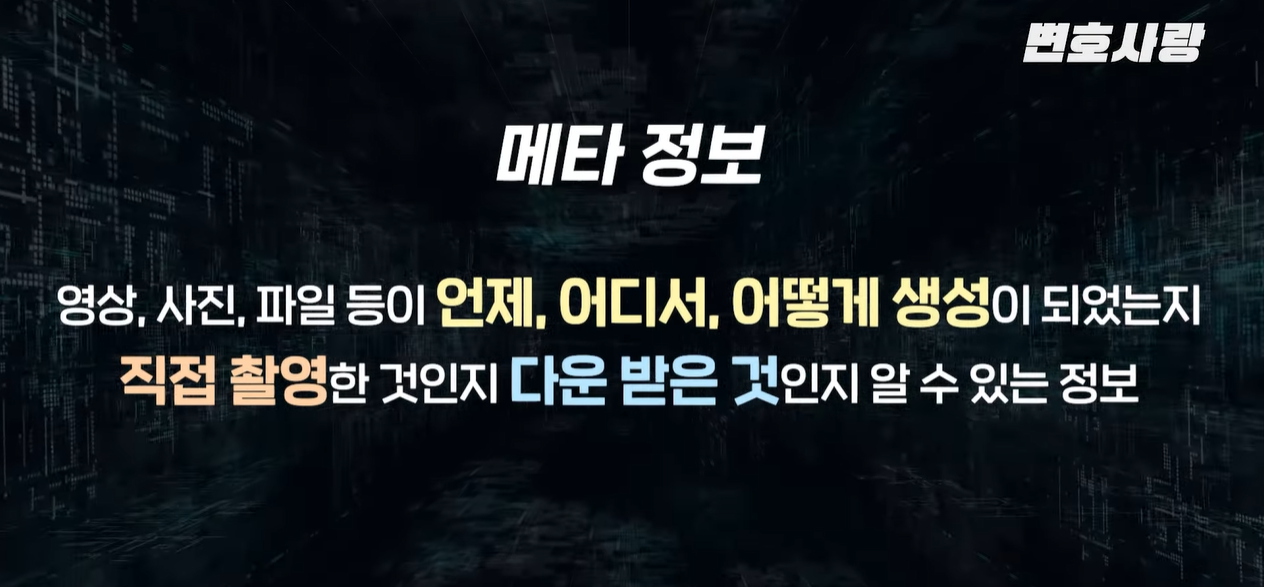 메타 정보는 디지털 파일에 담긴 일종의 개인 정보와 같습니다. 영상이나 사진이 언제, 어디서, 어떻게 생성되었는지, 촬영자가 누구인지, 다운로드한 파일인지 등을 알려주는 중요한 정보입니다.